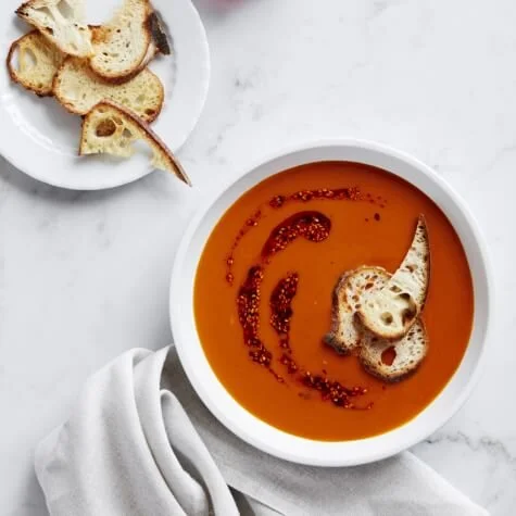 For this vegetable-based soup, we roast carrots, bell peppers and onion to bring out their natural sweetness, then whirl everything in a Vitamix with stock and harissa, a chile paste popular in North African cooking that lends bold flavor. A swirl of harissa-sesame oil finishes the soup with a spicy, nutty kick. Click For Link